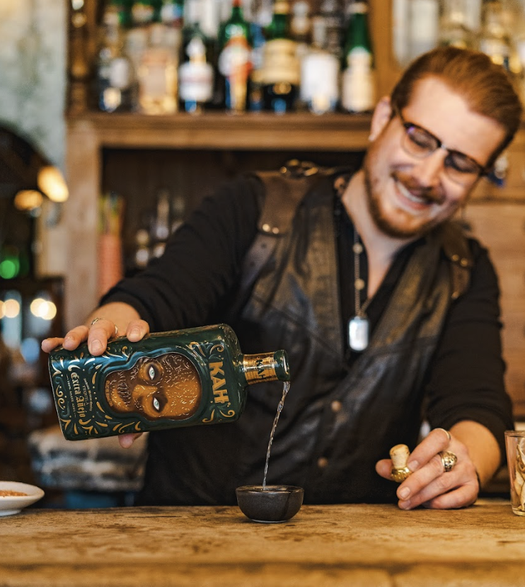 KAH Extra Anejo. Crafted at the Amber Production Tequila (previously known as Fabrica de Tequilas Finos), this well-aged tequila is the 4th release in KAH's lineup. Distilled from 100% blue agaves, it spends at least 3 years in American white oak. The attractive bottle with glow-in-the-dark elements is sure to attract attention!