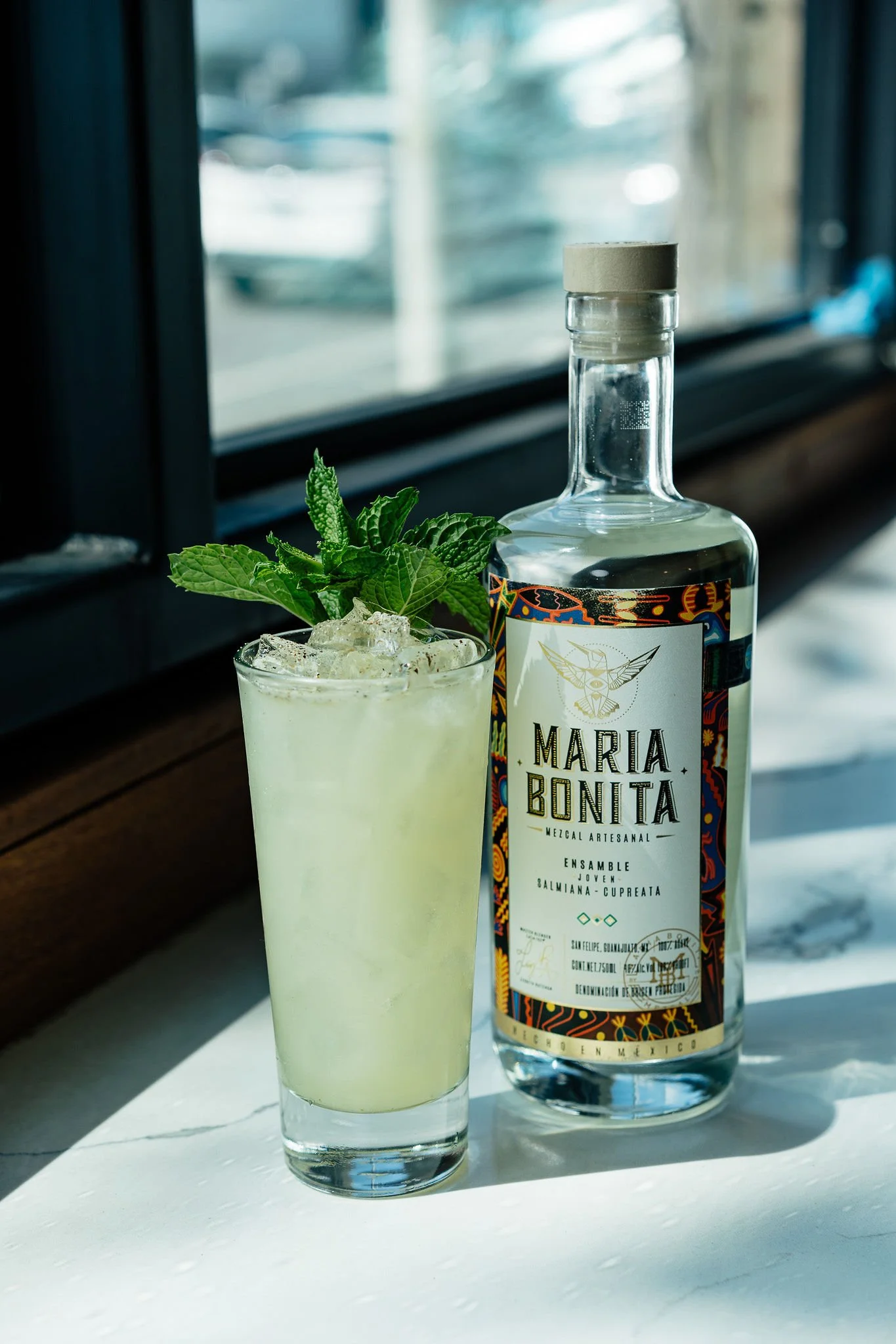 Maria Bonita Mezcal, orgeat, cucumber, lime, chile de árbol, black pepper, mint. Smoke and heat cut by mint and cucumber. Sweet and sharp, like Morrison stumbling out of the desert at dawn.